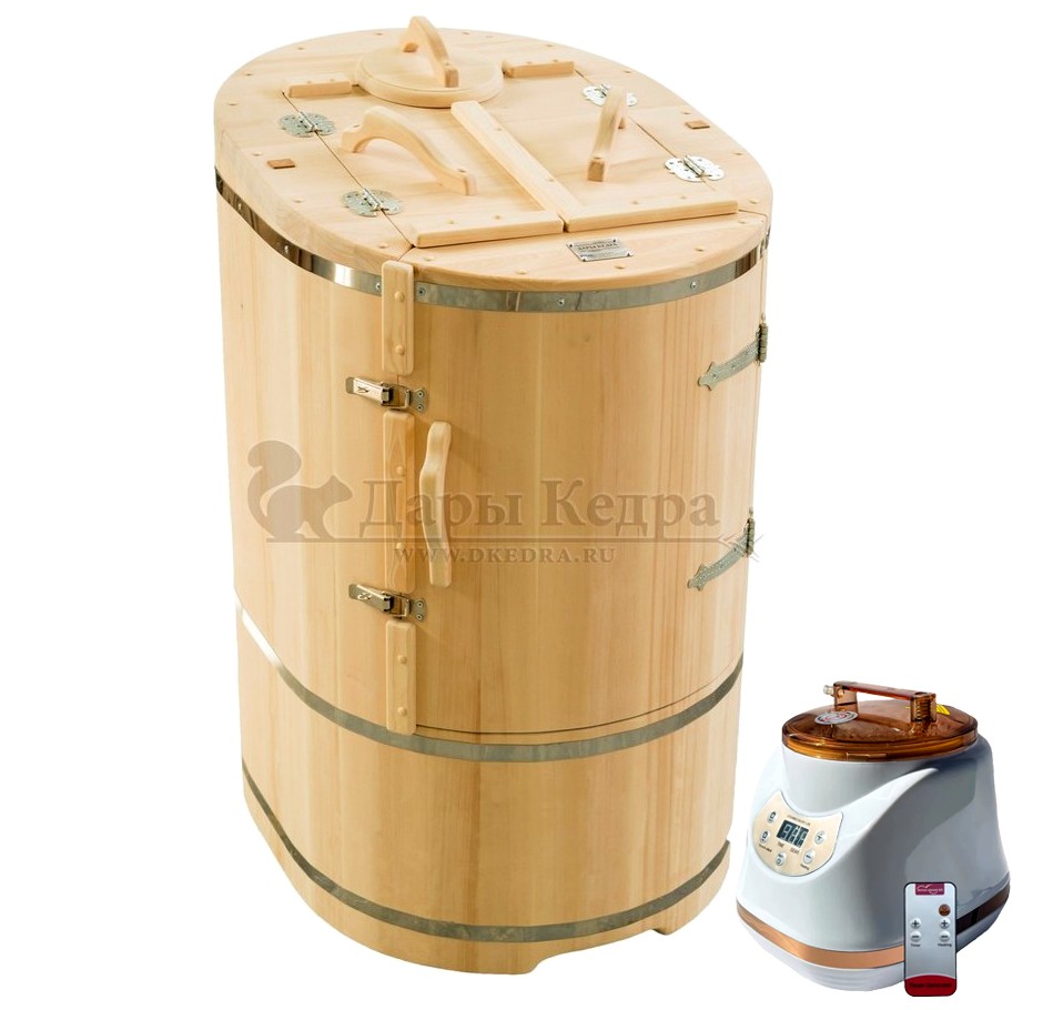 Готовый комплект «Универсальный»: кедровая бочка с парогенератором + био-защита изнутри и снаружи Готовый комплект - это полностью укомплектованный набор с фитобочкой для процедур парения. Овальная модель более просторна и удобна в использовании. Толщина стенок составляет 40-45 мм, что позволяет увеличить срок службы изделия. Верхний скос делает положение головы более комфортным и улучшает обзор. Фитобочка оборудована откидными створками, дверцей и отверстием для головы. Во время парения человек сидит внутри кедровой бочки, а голова находится снаружи. Благодаря этому исключается возможность перегрева. Подлокотники из кедра, встроенные ручки на створках и двери делают эксплуатацию более удобной. Парение в фитобочке благотворно влияет на организм в целом: повышается иммунитет, выводятся шлаки и токсины, улучшается работа органов тела и состояние кожи.