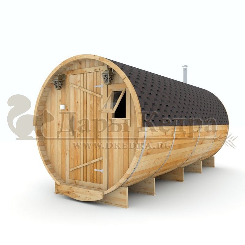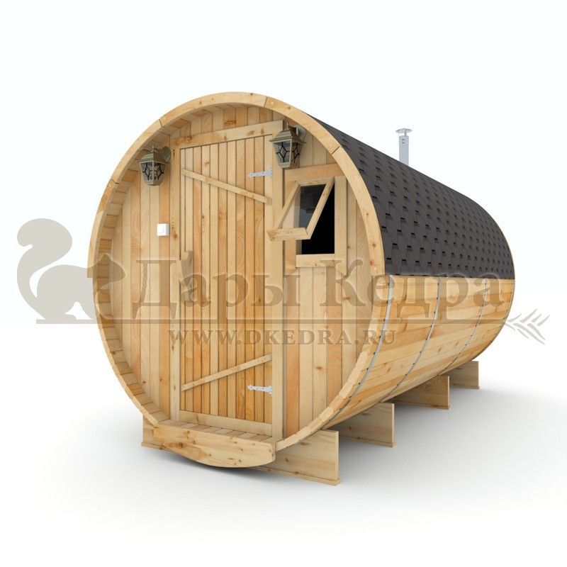 Баня-бочка круглая из кедра 4 метра Это изделие круглой вытянутой формы с двумя отделениями: раздевалкой и парной. Лавочки из кедра находятся по всей длине бани-бочки с обеих сторон. Печь расположена в парилке около дальней стены. Для удобства пользования в раздевалке установлена вешалка и полочка из кедра. За счет небольшой конструкции баня нагревается не более 30 минут. По вашему желанию баню-бочку можно дополнить печью с внешней загрузкой, благодаря которой весь мусор после топки останется на улице. Круглая баня-бочка не требует полноценный фундамент, поэтому при необходимости ее можно перенести в другое место. Обращаем Ваше внимание, что в стандартную комплектацию бани входят лавки в парной с обеих сторон. Дополнительно можно заказать полок открытого или закрытого типа! Кедр обладает ароматическими свойствами. Он не деформируется и влагоустойчив, при правильном уходе за деревом на нем не развиваются грибки и плесень.