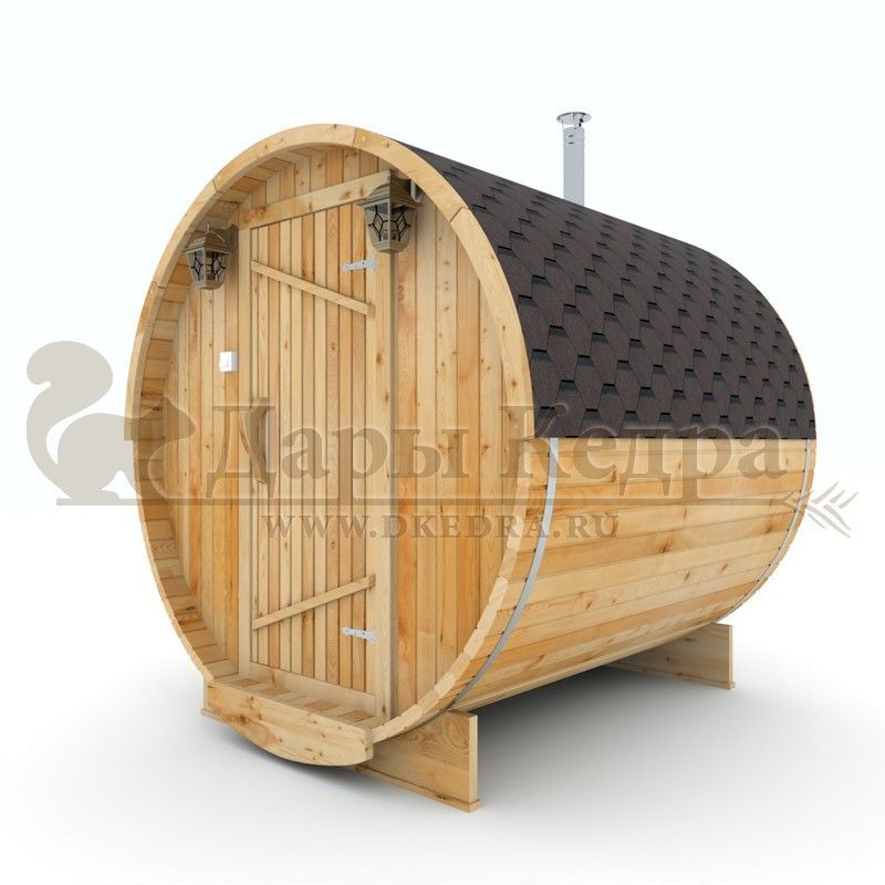 Баня-бочка круглая из кедра 2 метра Это изделие круглой вытянутой формы с одним парильным отделением. Внутреннее пространство включает в себя печь у дальней стены и лавки из кедра по обе стороны бани. За счет компактной формы баня нагревается в течение 30 минут. По вашему желанию ее можно укомплектовать козырьком, верандой и печью с внешней загрузкой, благодаря которой весь мусор после топки остается на улице. Круглая баня-бочка не требует полноценный фундамент, поэтому при необходимости ее можно перенести в другое место. Обращаем Ваше внимание, что в стандартную комплектацию бани входят лавки в парной с обеих сторон. Дополнительно можно заказать полок открытого или закрытого типа! Кедр обладает ароматическими свойствами. Он не деформируется и влагоустойчив, при правильном уходе за деревом на нем не развиваются грибки и плесень.