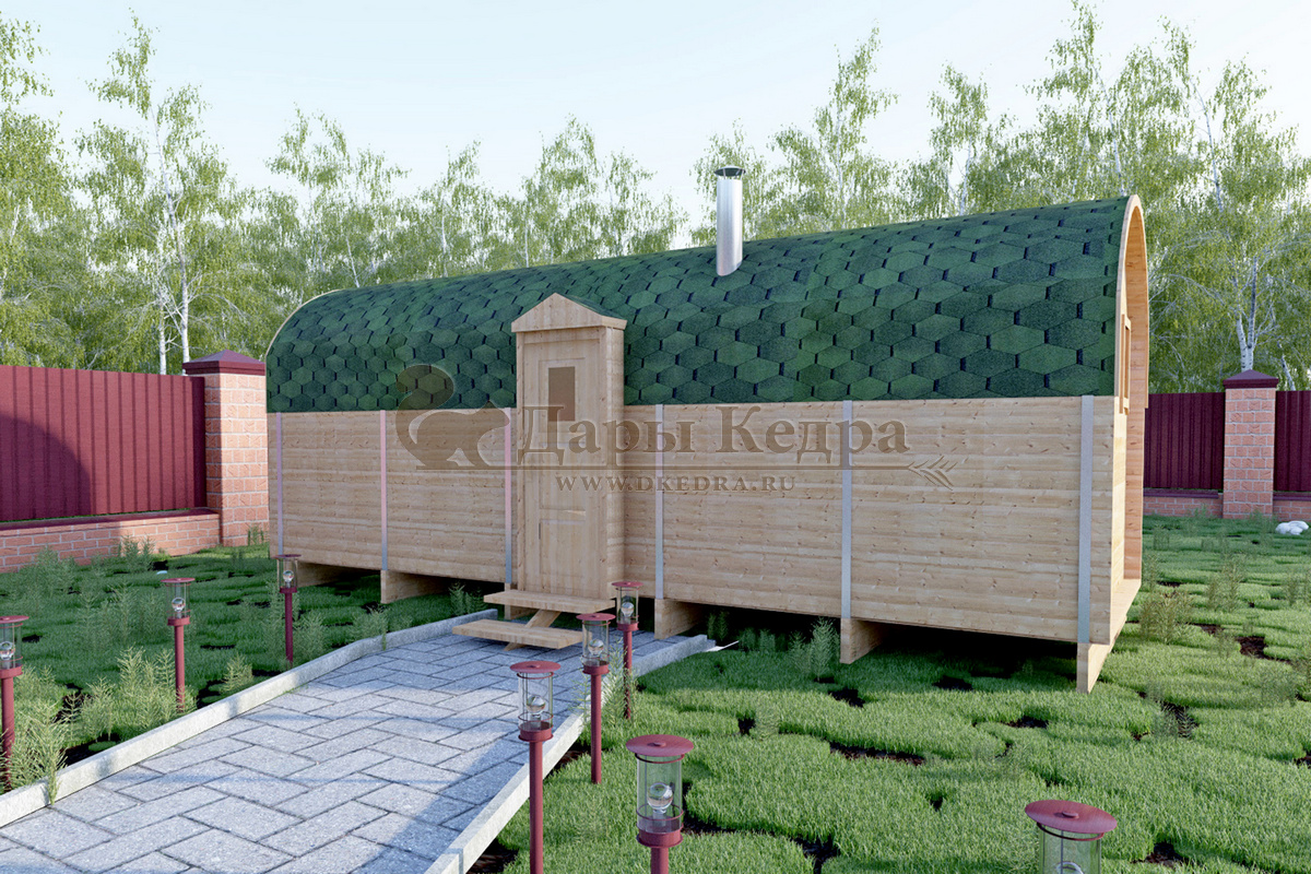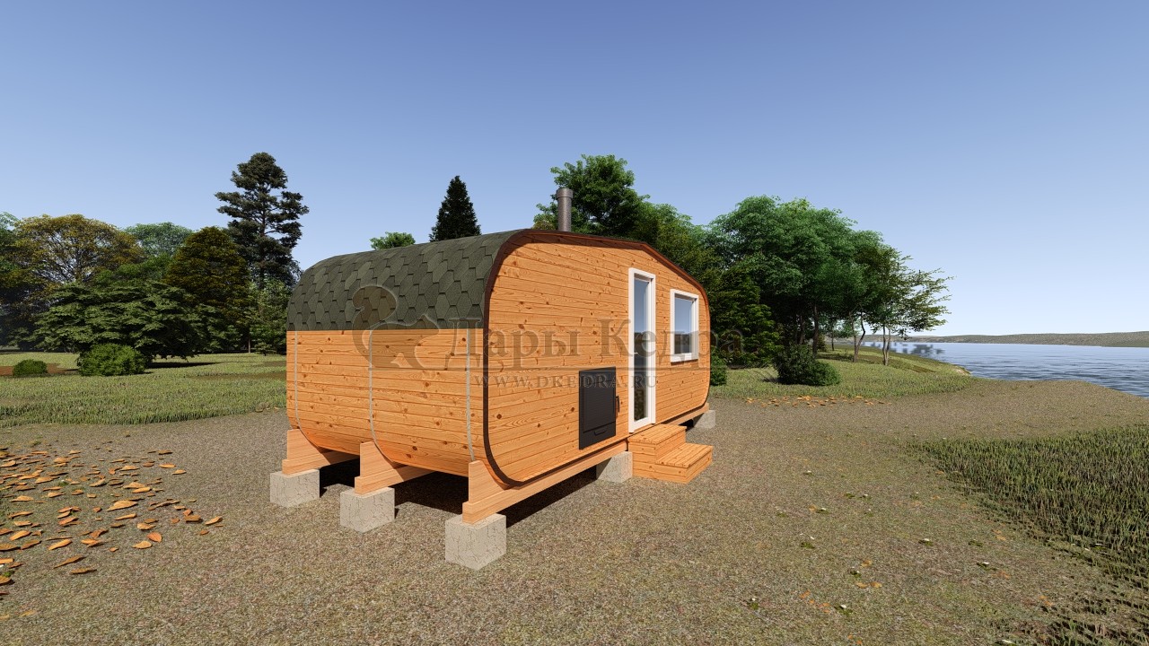 Симбиоз круглой и квадратной бани-бочки. Разработано с учётом эргономики, в ней так же просторно, как и в квадро-бочке, но при этом полукруглая крыша не дает задерживаться снегу и влаге на кровле. А еще такая баня безусловно красивая, мобильная и доступная каждому!