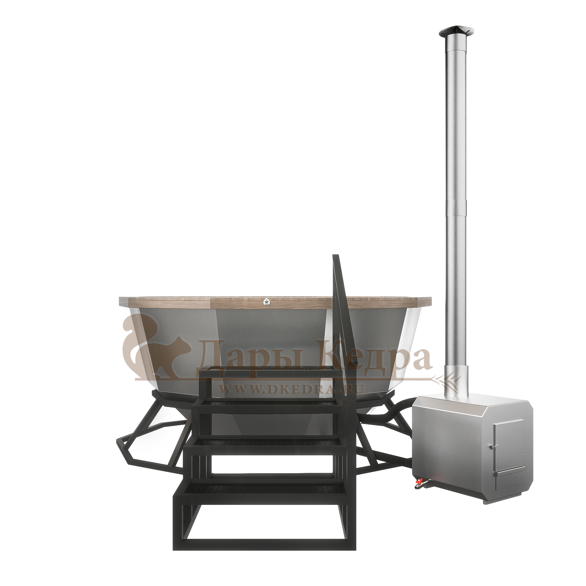Банный чан из нержавеющей стали Ø-2350 на подставке с приставной печью Банный чан с приставной печкой изготовлен из пищевой стали. Представляет собой большую ёмкость в виде чаши, при нагревании которой можно париться на свежем воздухе. Чан установлен на устойчивую металлическую подставку и оснащен приставной печью с дымоходом. Банный чан оборудован кедровым бортом, скамейками, подспинниками, трапом для ног и приставной лестницей.