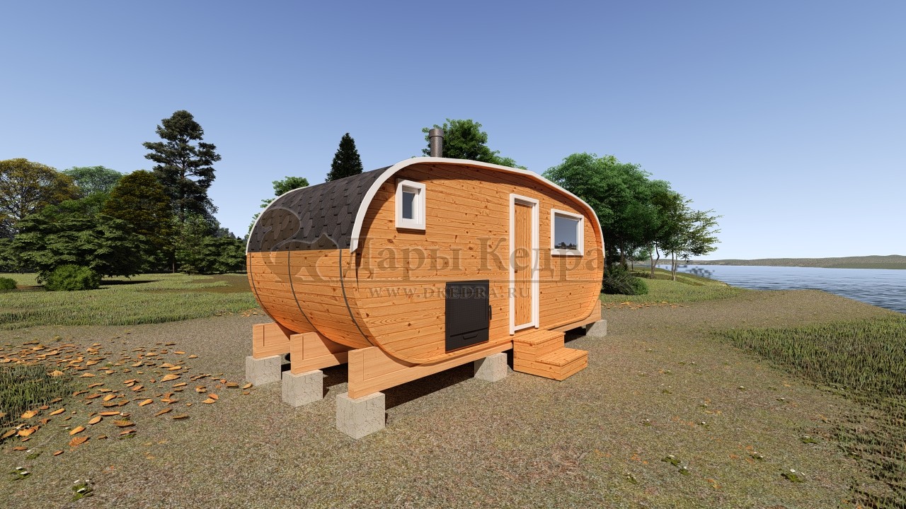 Овальная баня-бочка из кедра просторная и вместительная. Имеет два отделения: раздевалку, которую можно использовать как комнату отдыха, и парилку. Для удобства пользования раздевалка оснащена лавочкой, полкой и вешалкой из кедра. В парильном отделении располагается печь и двухуровневый открытый полок. Для установки такой модели не требуется полноценный фундамент, поэтому при необходимости ее можно перенести на другое место. Так же баню-бочку можно укомплектовать верандой со скамейками, козырьком и печью с внешней загрузкой, благодаря которой весь мусор после топки останется на улице.