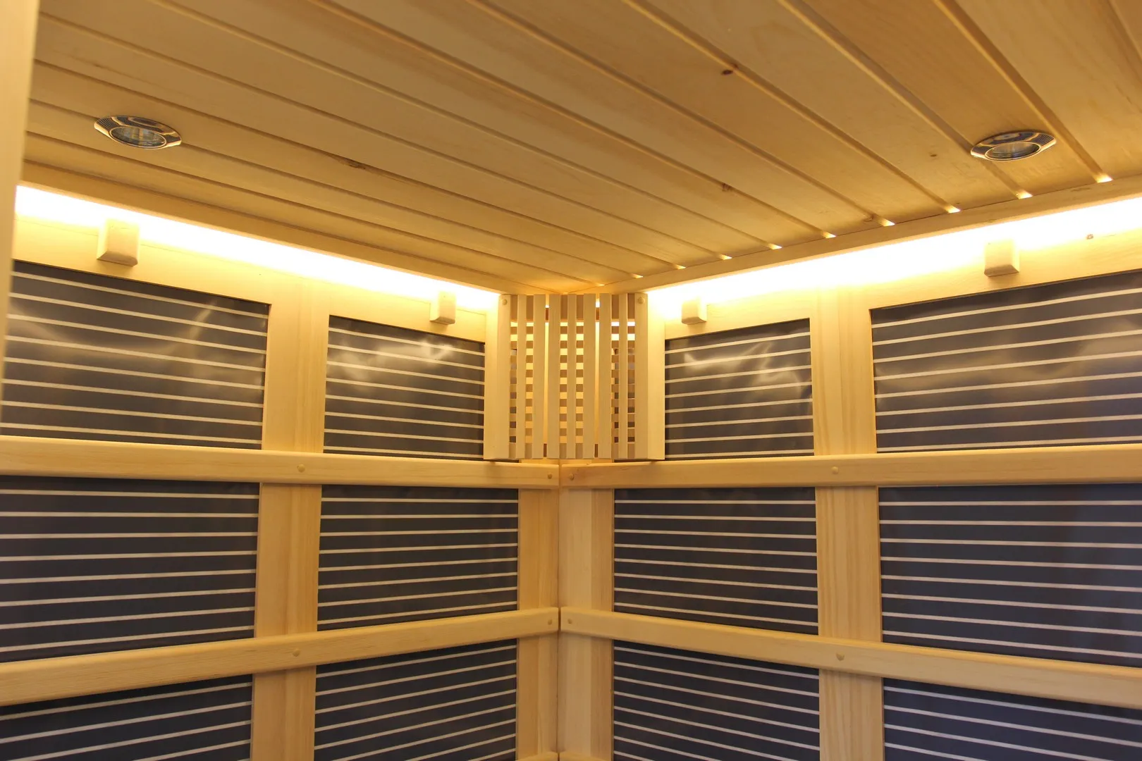 Это специально оборудованная кедровая кабина для прогрева тела человека сухим теплом. Воздух в таких парных не нагревается. Инфракрасные лучи воздействуют на тело, равномерно прогревая мышцы, суставы и органы. Карбоновые излучатели, встроенные в стены кабины, обладают мягким прогревом, что полностью исключает возможность ожога. Работает кабина за счет электричества. Установка сауны в угол, позволяет рационально использовать пространство помещения. Подходит как для домашнего использования, так и для коммерции.