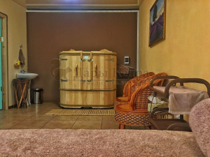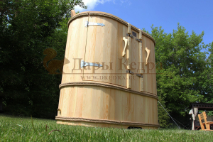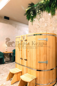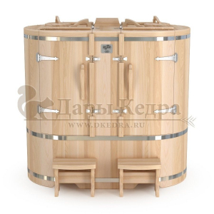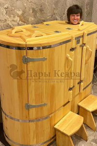 Двухместная фитобочка из кедра - это парная, в которой удобно принимать процедуры двум людям. Она оборудована откидными створками, дверцей, отверстием для головы и перегородкой (по желанию). Толщина стенок составляет 25 мм. Во время парения человек находится внутри кедровой бочки, а голова снаружи. Благодаря этому исключается возможность перегрева. Подлокотники из кедра и внутренние ручки делают эксплуатацию фитобочки более удобной.