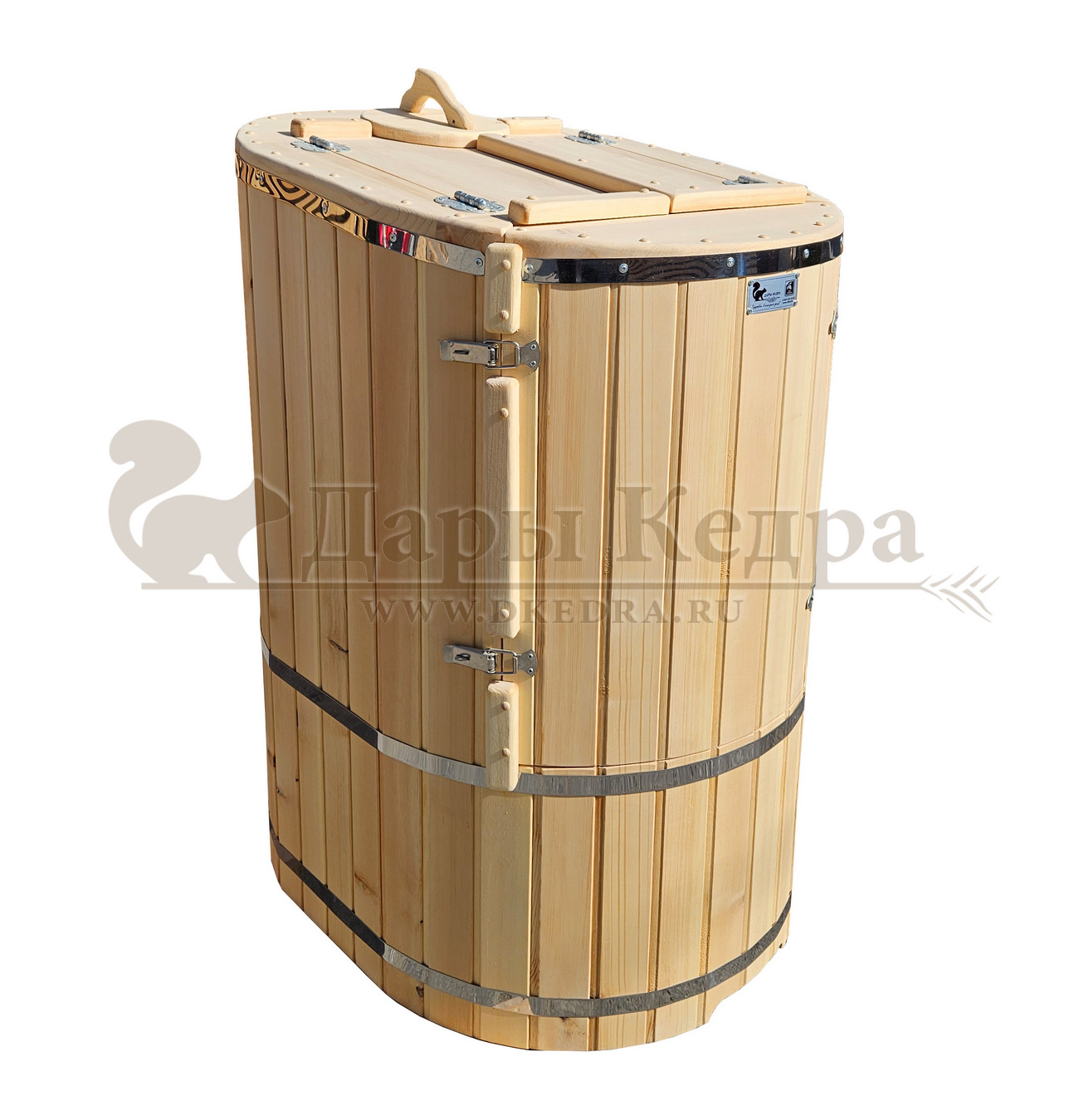 Кедровая бочка (фитобочка) овальная со встроенным парогенератором «Профессиональная» Овальная форма этой кедровой бочки позволяет комфортно разместится даже высоким людям. Встроенный парогенератор исключает дополнительный монтаж. Ширина 78 мм позволяет занести бочку в помещение со стандартным проёмом в собранном виде. Толщина стенок 45 мм позволяет увеличить срок службы изделия. Подходит для коммерческого использования.