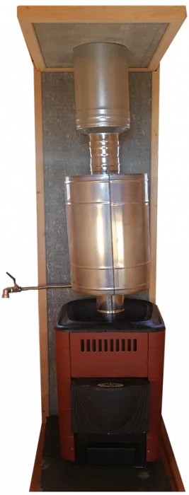 Также для комфортной эксплуатации парной из кедра предусмотрена в комплектации дровяная печь Термофор с трубой и дымоходом в сборе. Печь соединена с баком для горячей воды. Чтобы начать пользоваться баком с водой, необходимо дополнить его краном ¾. Труба устанавливается согласно инструкции от производителя печи, ниже показана последовательность установки трубы.